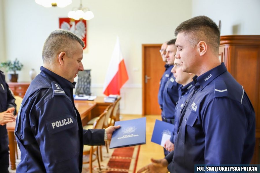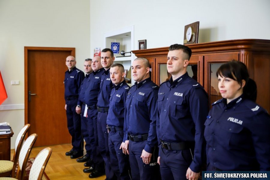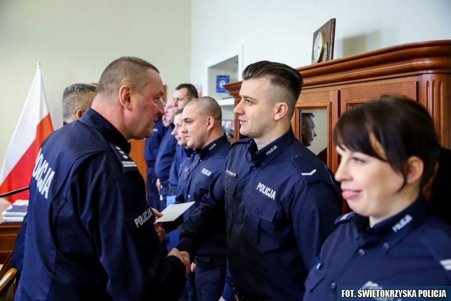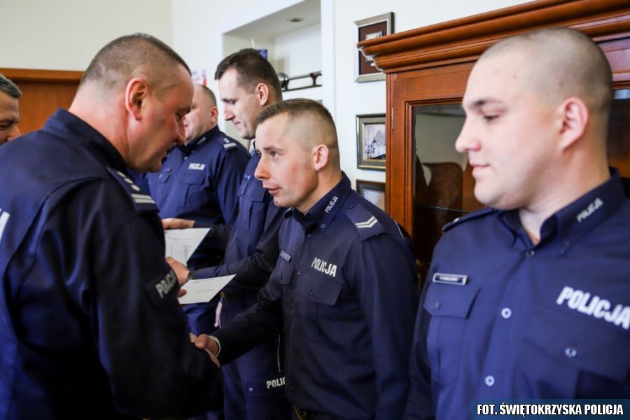 Dziś szef świętokrzyskich policjantów insp. Paweł Dzierżak wręczył nagrody łącznie 10 funkcjonariuszom z kieleckiego oddziału prewencji, Komendy Miejskiej Policji w Kielcach oraz Komendy Powiatowej Policji w Ostrowcu Świętokrzyskim. Pełniący obowiązki Komendanta Wojewódzkiego Policji w Kielcach oraz jego Pierwszy Zastępca insp. Artur Bielecki podziękował funkcjonariuszom za ich ponadprzeciętne zaangażowanie w służbę oraz przekazał listy gratulacyjne.