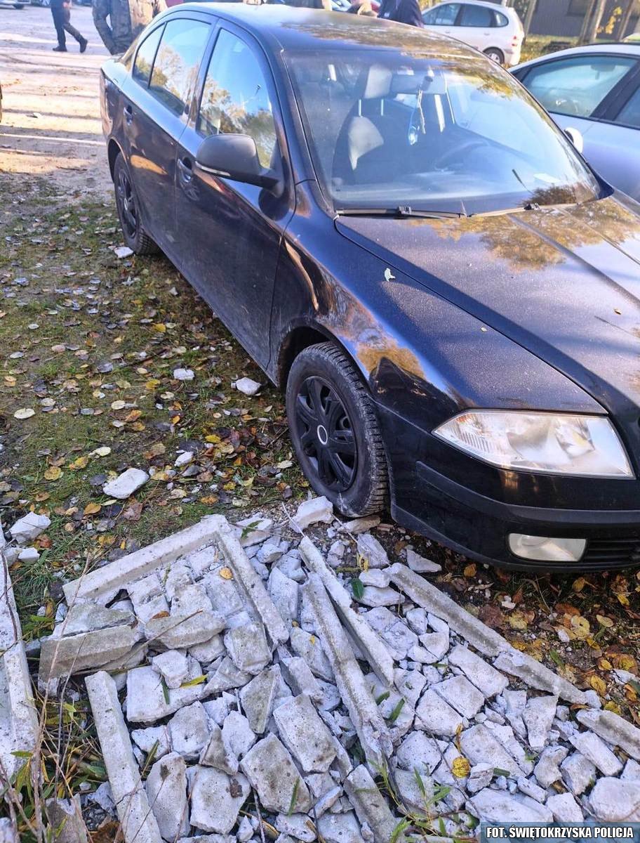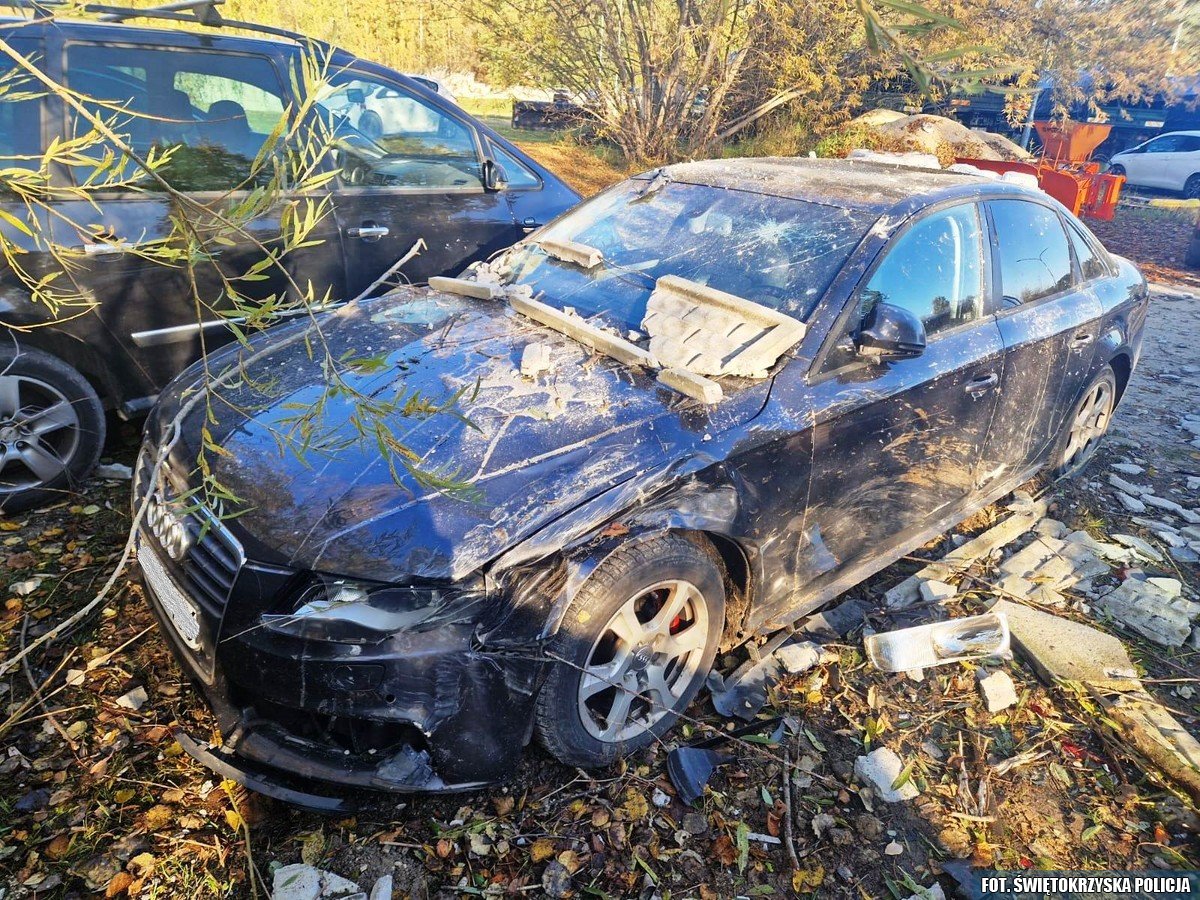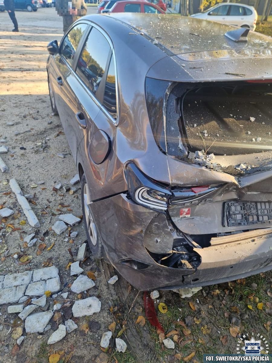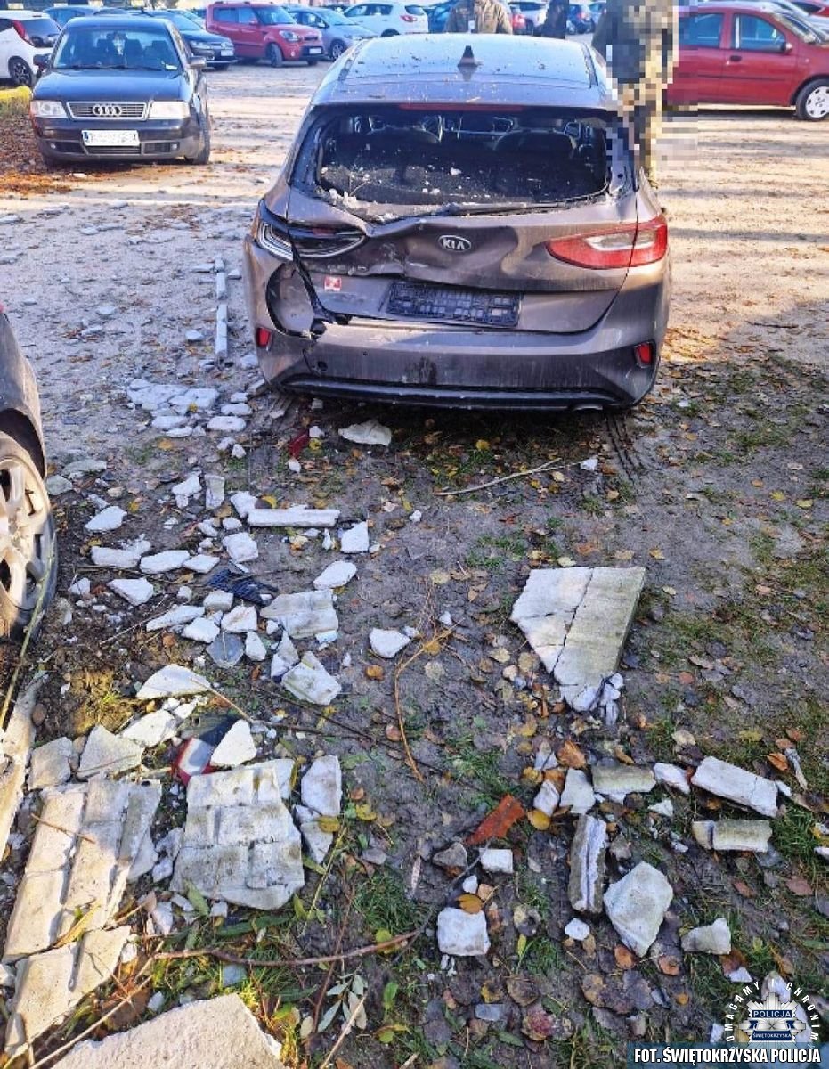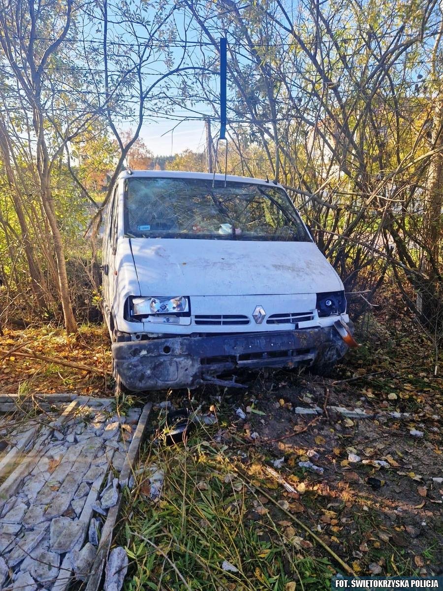 Z ustaleń funkcjonariuszy Wydziału Ruchu Drogowego kieleckiej komendy wynika, że kierujący pojazdem marki Renault Master 47-letni mieszkaniec powiatu, na łuku drogi zjechał z jezdni i uderzył w ogrodzenie jednej z posesji. Betonowy płot został zniszczony, a siła uderzenia była na tyle duża, że samochód przebił się przez ogrodzenie i uszkodził pięć zaparkowanych za nim pojazdów. Kierowca nie odniósł bardzo poważnych obrażeń, ale został jednak zatrzymany przez funkcjonariuszy. Z uwagi na fakt, iż od mężczyzny była wyczuwalna silna woń alkoholu a obrażenia powstałe na skutek zdarzenia nie pozwoliły przeprowadzić badania alkomatem od kierującego francuskim pojazdem została pobrana krew do badań w celu określenia zawartości alkoholu w jego organizmie.