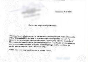 Autor listu podkreśla nie tylko sprawne i profesjonalne działania funkcjonariuszek, ale również okazane mu wsparcie, empatię oraz pomoc psychologiczną w trudnych chwilach tuż po wypadku. Szczególne słowa uznania skierował do asp. szt. Karoliny Wiśniewskiej, która w tamtym czasie pełniła służbę jako dzielnicowa w Posterunku Policji w Bielinach. Mężczyzna podkreślił, że jej postawa i zaangażowanie tamtego feralnego dnia miały dla niego ogromne znaczenie nie tylko na miejscu zdarzenia, ale również w czasie późniejszego pobytu w szpitalu oraz w trakcie rekonwalescencji.