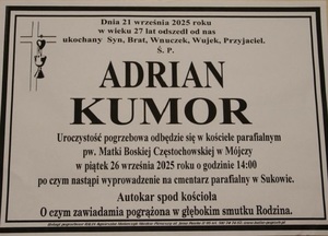Z wielkim smutkiem przyjęliśmy informację o śmierci naszego kolegi sierż. Adriana Kumora. Służył w Komendzie Miejskiej Policji w Kielcach w Wydziale Ruchu Drogowego. Adrian dał się poznać jako sumienny i zaangażowany w służbę policjant, a także jako wspaniały kolega. Miał tylko 27 lat. Rodzinie, najbliższym i przyjaciołom kondolencje i wyrazy głębokiego współczucia w imieniu kadry kierowniczej garnizonu, policjantów i pracowników składa Komendant Wojewódzki Policji w Kielcach inspektor Zbigniew Nowak.