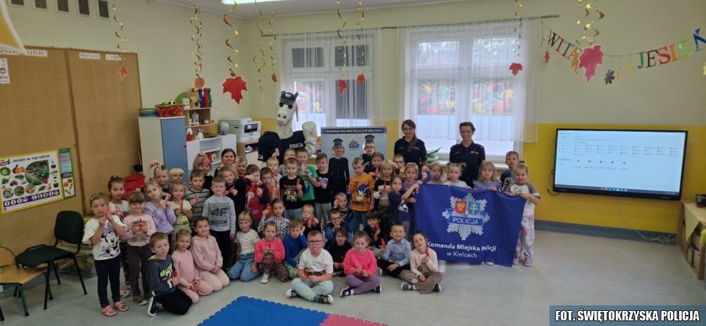 Wczoraj z uwagi na przypadający 1 października 2025 roku Ogólnopolski Policyjny Dzień Odblasków funkcjonariuszki Wydziału Prewencji Komendy Miejskiej Policji w Kielcach odwiedziły Przedszkole Samorządowe Pluszowego Misia w Nowinach.