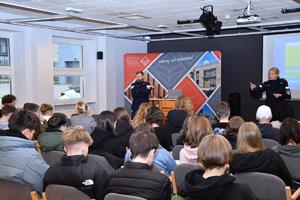 Funkcjonariusze zapoznali uczniów z Ustawą o Wspieraniu i Resocjalizacji Nieletnich. Przedstawili młodzieży prawne konsekwencje negatywnego zachowania oraz poinformowani jakie środki wychowawcze i poprawcze stosuje Sąd Rodzinny wobec nieletnich. Uświadamiali także ,iż przemoc rówieśnicza to wszelkie formy agresji w tym fizycznej, psychicznej, werbalnej i cyberprzemoc. Ofiarami takiej przemocy są dzieci i młodzież. Jest to bardzo niebezpieczne zjawisko, szczególnie w dzisiejszych czasach, kiedy negatywne zachowania w stosunku do innych niejednokrotnie są nagrywane i publikowane w Internecie przez co szerokie grono osób ma dostęp do materiałów kompromitujących osobę pokrzywdzoną. Szczególna uwagę zwrócono na konsekwencje prawne i życiowe przemocy rówieśniczej, które mogą być długofalowe i bardzo poważne, wpływając negatywnie zarówno na zdrowie psychiczne jak i fizyczne osoby pokrzywdzonej. Szereg ciekawych pytań zadanych przez uczestników oraz owacje na stojąco były wyrazem uznania dla prowadzących.