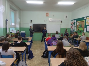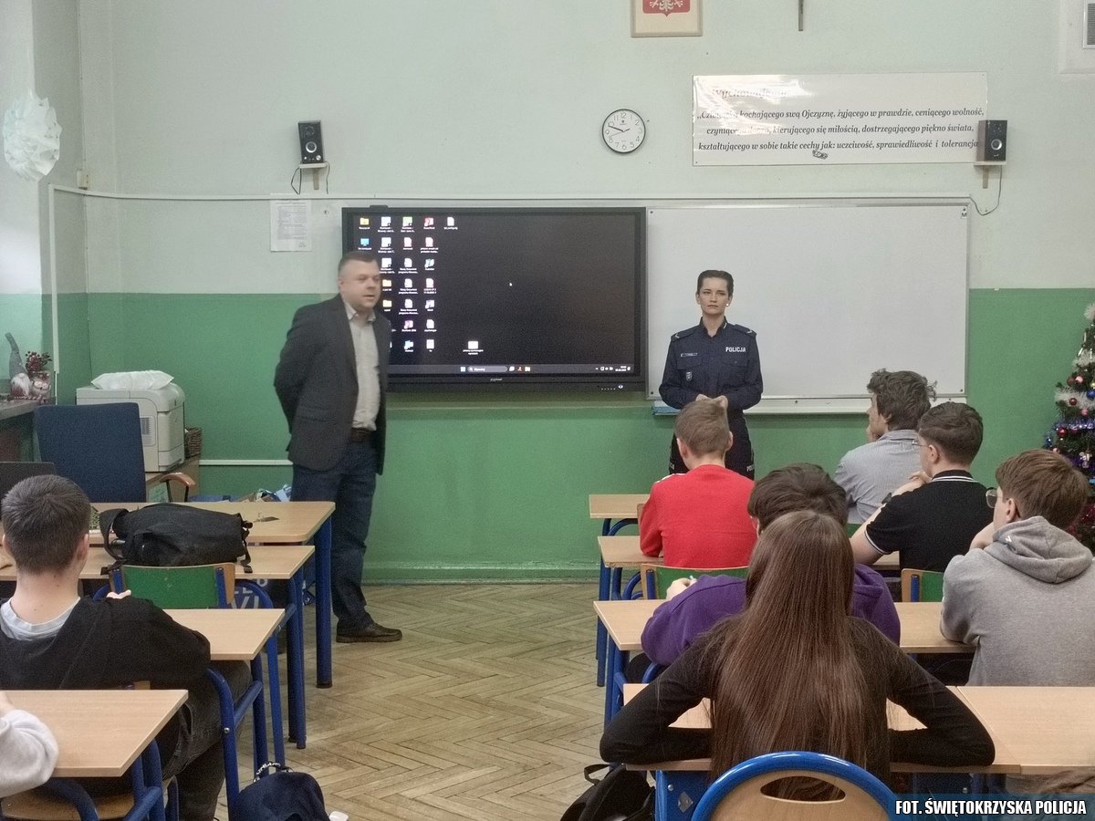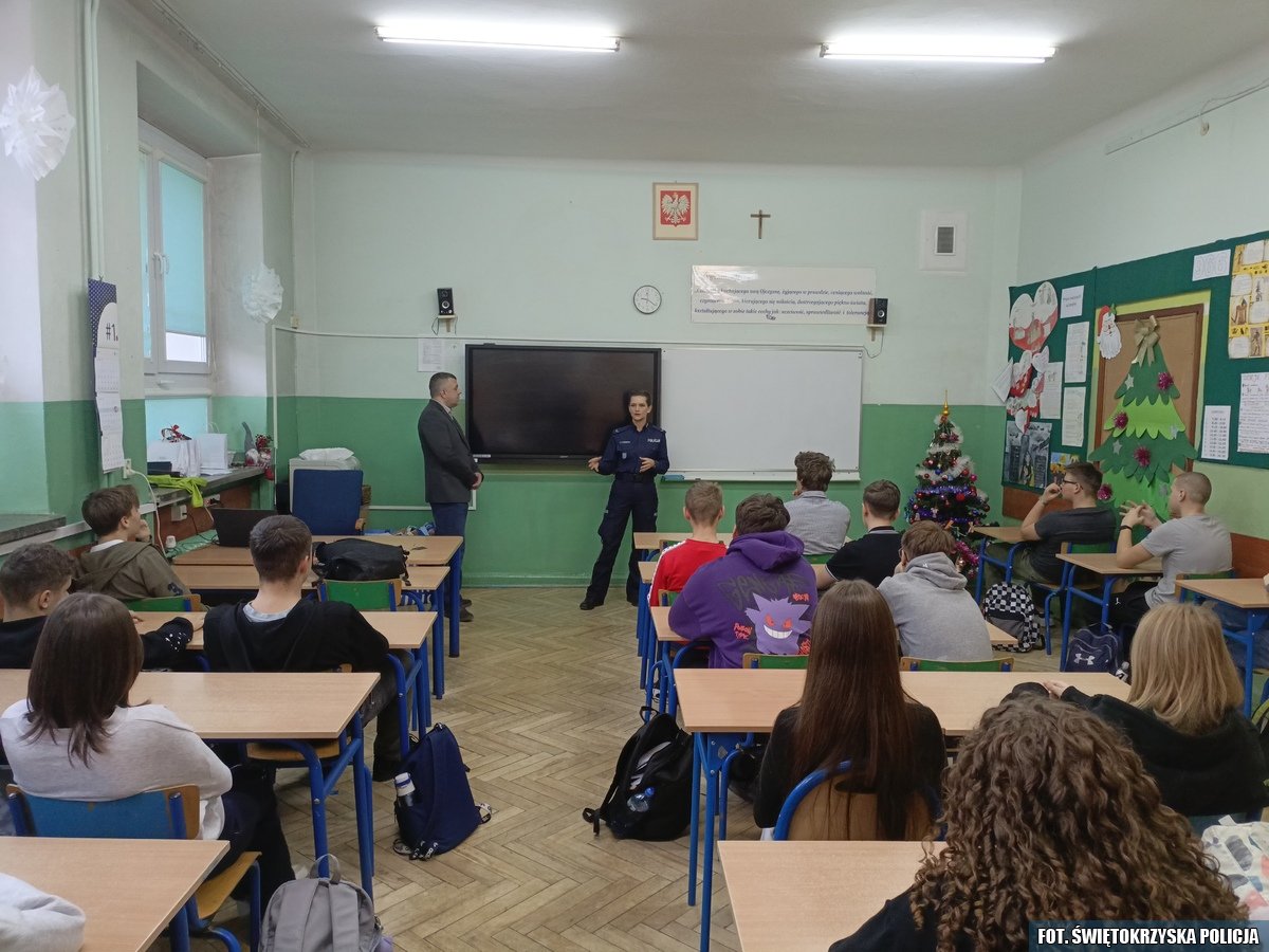 Policjantka z Wydziału Prewencji Komendy Miejskiej Policji w Kielcach wspólnie z funkcjonariuszem Wydziału Poszukiwań i Identyfikacji osób Komendy Wojewódzkiej Policji w Kielcach przeprowadzili spotkanie profilaktyczne w Szkole Podstawowej nr 2 w Kielcach. Przekazali uczniom informacje dotyczące odpowiedzialności karnej nieletnich oraz przejawów demoralizacji. Uczniowie dowiedzieli się jakie konsekwencje prawne grożą osobom za popełnianie czynów karalnych oraz jakimi środkami oddziaływania wychowawczego dysponuje sąd rodzinny. Policjanci wyjaśnili uczniom pojęcie cyberprzemocy, kładąc zdecydowany nacisk na hejt. Uświadomili ich również, że publikowanie i rozsyłanie ośmieszających informacji, zdjęć, filmów, podszywanie się pod inną osobę czy tez obraźliwe komentowanie wpisów niesie za sobą poważne konsekwencje. W trakcie spotkań funkcjonariusze podkreślali jak ważne jest dbanie o własne bezpieczeństwo w sieci, a przede wszystkim wskazali gdzie można szukać pomocy w kryzysowej sytuacji, gdzie się zgłaszać, kogo informować w celu uzyskania wsparcia i zbudowania poczucia bezpieczeństwa.